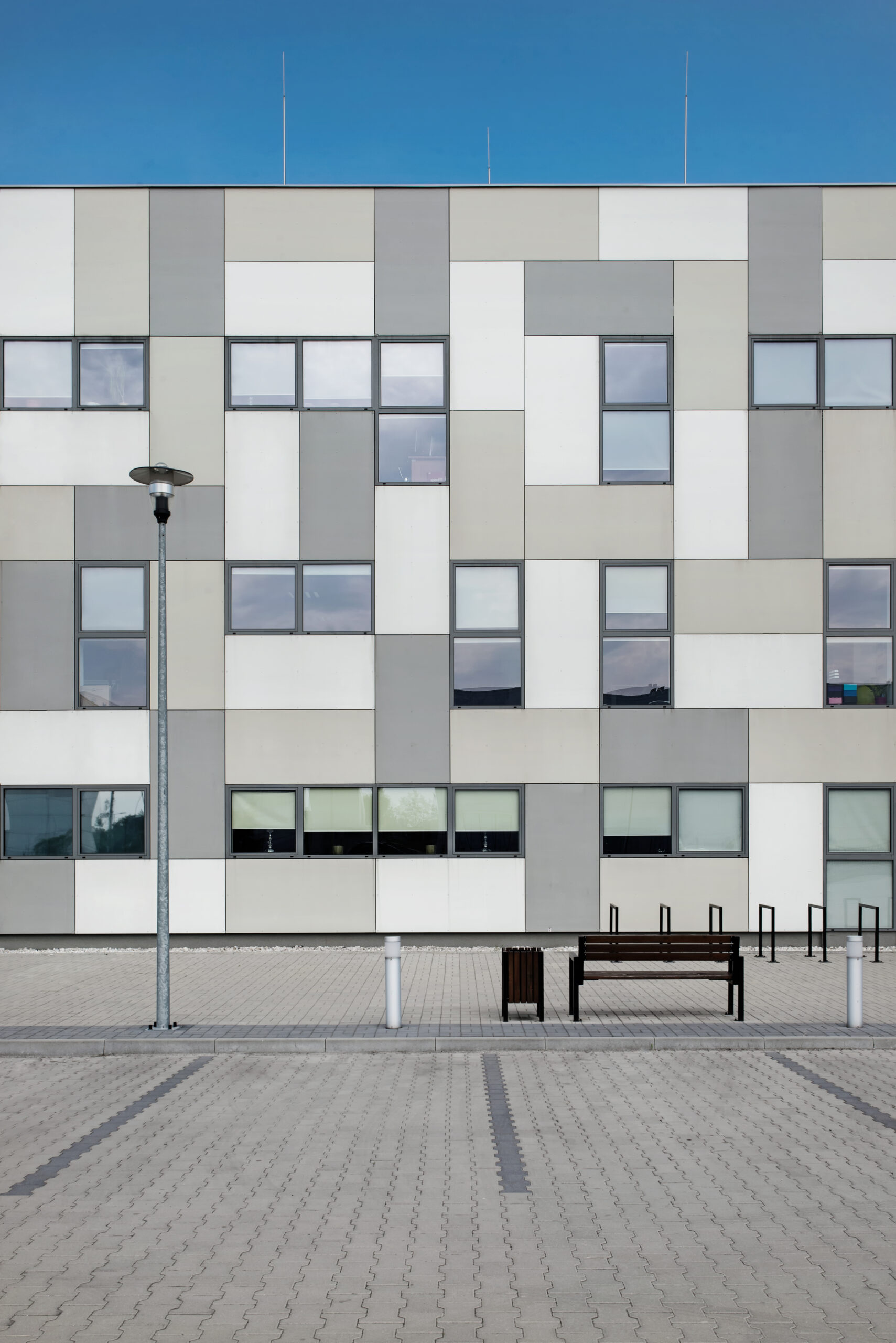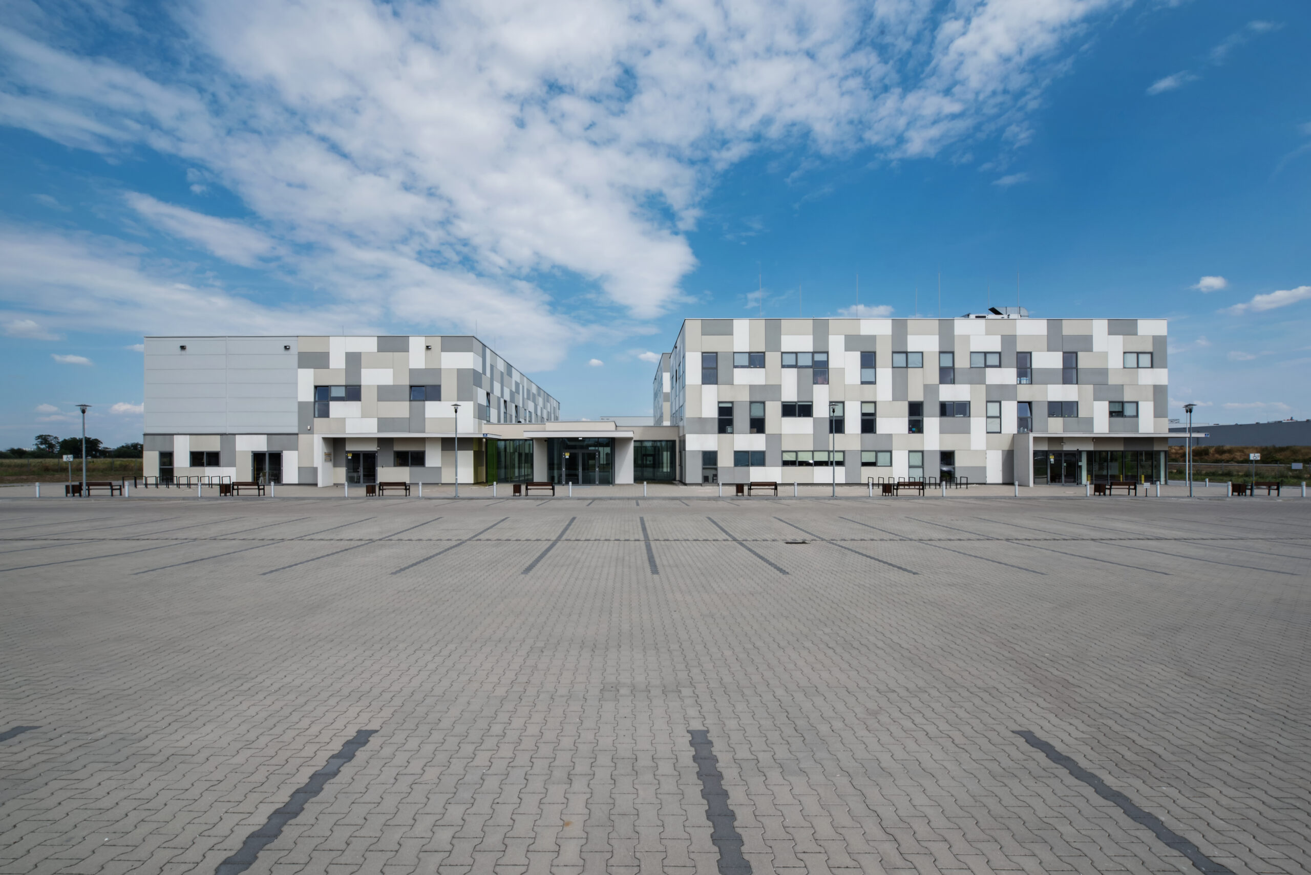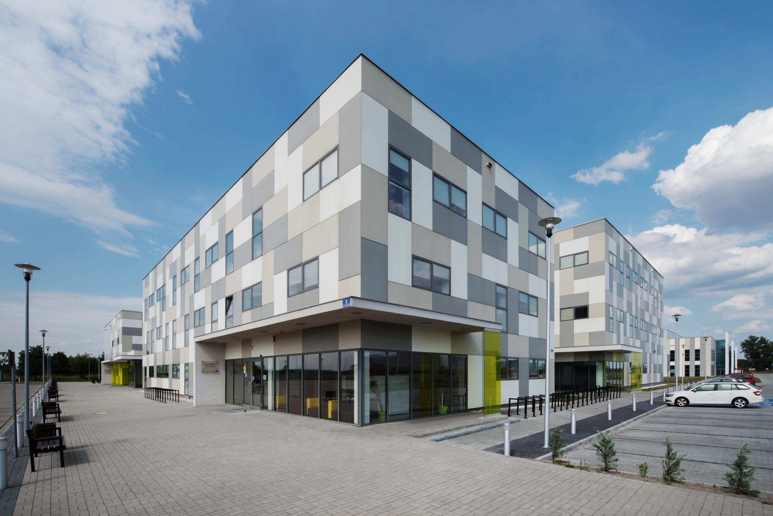 First stage of Science and Technological Park in Opole consisting of two buildings. Office and laboratory/production building with space that could be rent by small, young companies and startups. Simple design and construction allow a modular interior plan which can be adjusted for tenants needs. Modularity of the interior was an inspiration for the design of the modular facade grid, filled with facade panels in different shades of gray and windows of the same size.